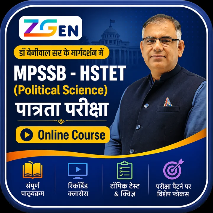 डॉ. बेनीवाल सर के मार्गदर्शन में प्रस्तुत है MPSSB – HSTET (Political Science) पात्रता परीक्षा हेतु एक सम्पूर्ण और लक्ष्य-केन्द्रित Online Course, जो आपको परीक्षा में सफलता दिलाने के लिए डिज़ाइन किया गया है। यह कोर्स विशेष रूप से उन अभ्यर्थियों के लिए तैयार किया गया है जो Political Science विषय में मजबूत पकड़ बनाकर MPSSB एवं HSTET जैसी पात्रता परीक्षाओं में चयन सुनिश्चित करना चाहते हैं। 📚 Course Highlights: ✅ Complete Syllabus Coverage – HSTET एवं MPSSB के नवीनतम सिलेबस के अनुसार ✅ Conceptual Clarity + Exam Oriented Approach ✅ Topic-wise Detailed Video Lectures ✅Written Notes PDF सामग्री ✅ Regular Practice Sets & MCQs ✅ Previous Year Questions (PYQs) Analysis 💡 Course Benefits: मजबूत बेसिक से एडवांस स्तर तक तैयारी समय प्रबंधन और स्मार्ट स्ट्रेटेजी परीक्षा पैटर्न के अनुसार प्रैक्टिस आत्मविश्वास में वृद्धि 📲 Mode: 100% Online Anytime, Anywhere Learning 👉 अगर आप MPSSB – HSTET (Political Science) में सफलता पाना चाहते हैं, तो यह कोर्स आपके लिए एक परफेक्ट मार्गदर्शक साबित होगा।